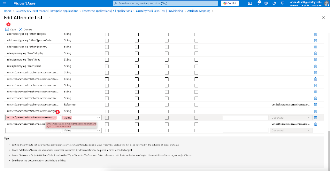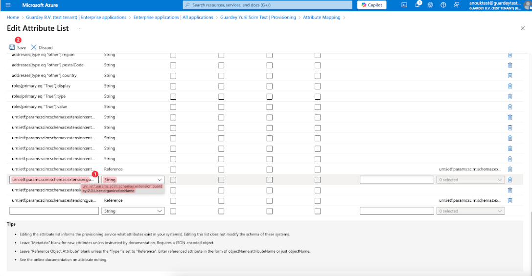 Add new “urn:ietf:params:scim:schemas:extension:guardey:2.0:User:organizationName” attribute to Provisioning schema and save changes