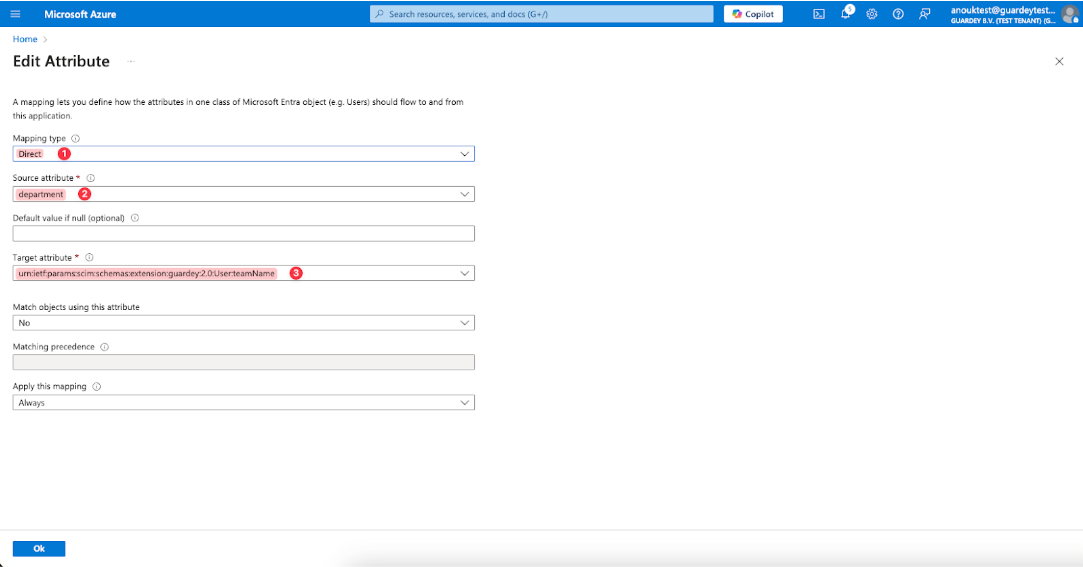 We are configuring the conversion of the source "department" attribute to the target "urn:ietf:params:scim:schemas:extension:guardey:2.0:User:teamName" attribute (Guardey API) because the Guardey API expects this attribute for the User object. If needed, you can use another source attribute here, but you must use the target attribute exactly as specified above.