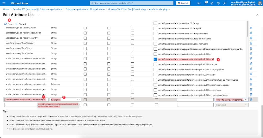 Add new "urn:ietf:params:scim:schemas:extension:guardey:2.0:User:teamLeaderId" attribute to Provisioning schema and save changes