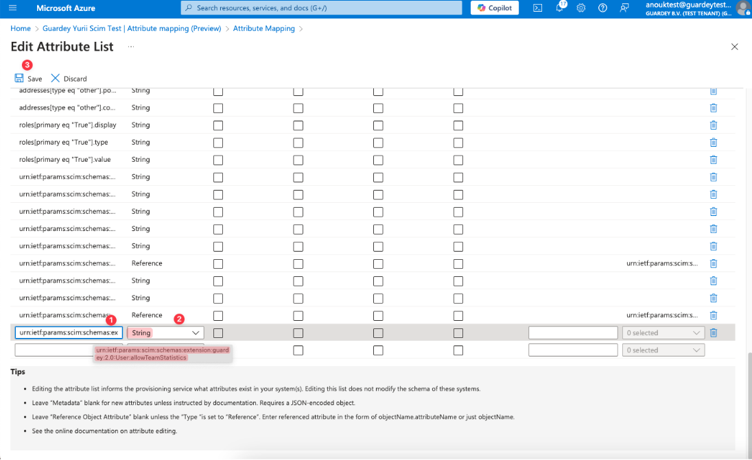 Add new "urn:ietf:params:scim:schemas:extension:guardey:2.0:User:allowTeamStatistics" attribute to Provisioning schema and save changes