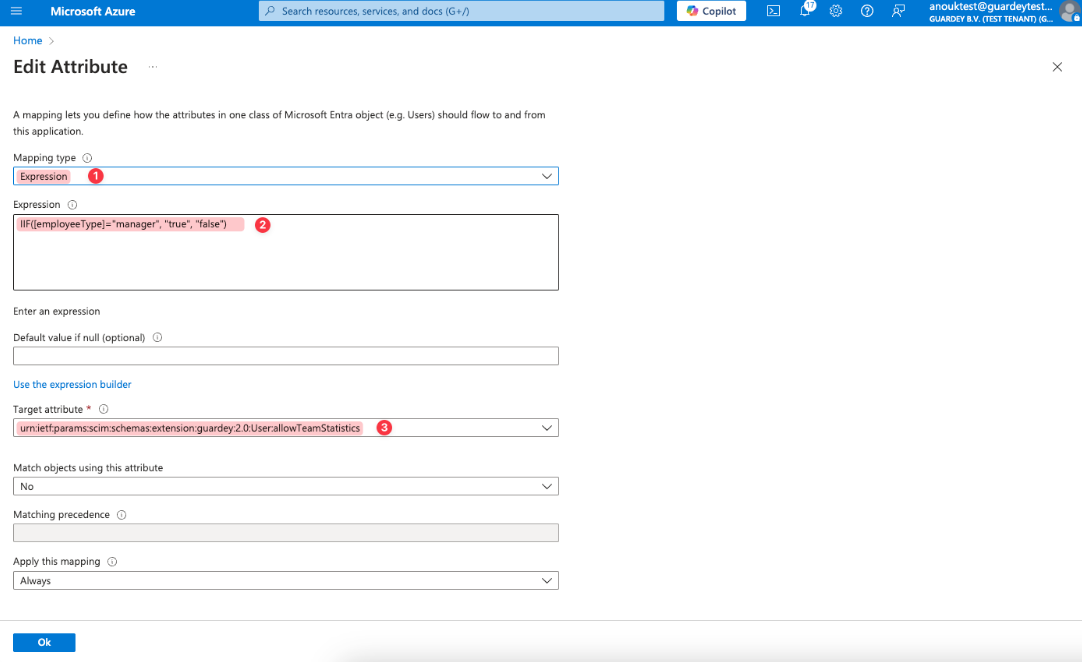 We are configuring the conversion of the source "employeeType" attribute to the target "urn:ietf:params:scim:schemas:extension:guardey:2.0:User:allowTeamStatistics" attribute (Guardey API), because the Guardey API expects this attribute for the User object. If needed, you can use another source attribute here, but you must use the target attribute exactly as specified above.