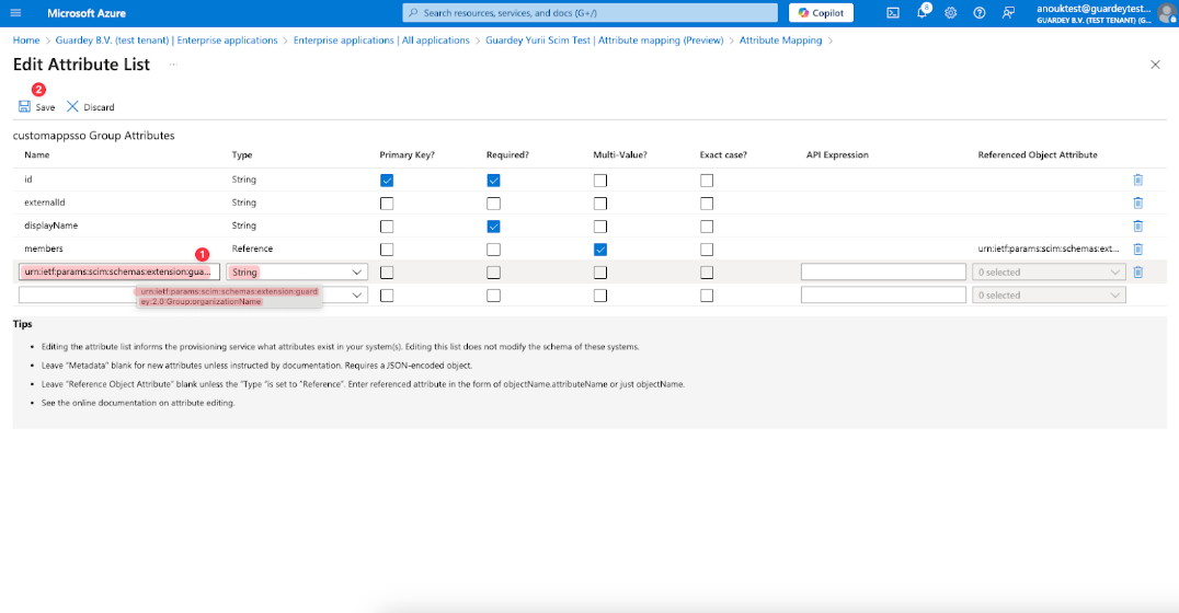 Add new “urn:ietf:params:scim:schemas:extension:guardey:2.0:Group:organizationName” attribute to Provisioning schema and save changes