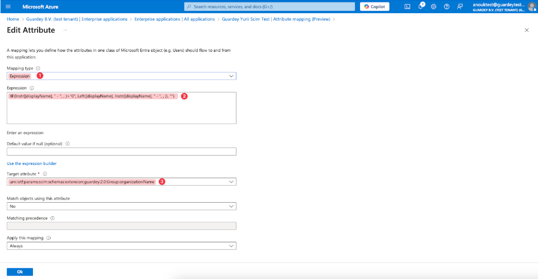 We use the mapping type "Expression" to convert "displayName" source attribute to “urn:ietf:params:scim:schemas:extension:guardey:2.0:Group:organizationName”target attribute (Guardey API) because Guardey API expects this attribute for groups.