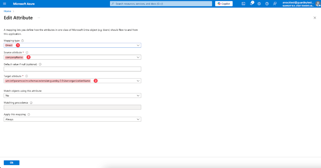 We are configuring the conversion of the source "companyName" attribute to the target "urn:ietf:params:scim:schemas:extension:guardey:2.0:User:organizationName" attribute (Guardey API), because the Guardey API expects this attribute for the User object. If needed, you can use another source attribute here, but you must use the target attribute exactly as specified above.