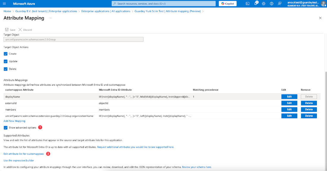 Go to Provision Microsoft Entra ID Groups, click “Show advanced options,” and then click “Edit attribute list for customappsso.”