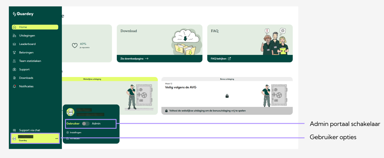 Wanneer je admin-rechten hebt, zie je in Guardey een extra optie om het beheerdersgedeelte te openen.